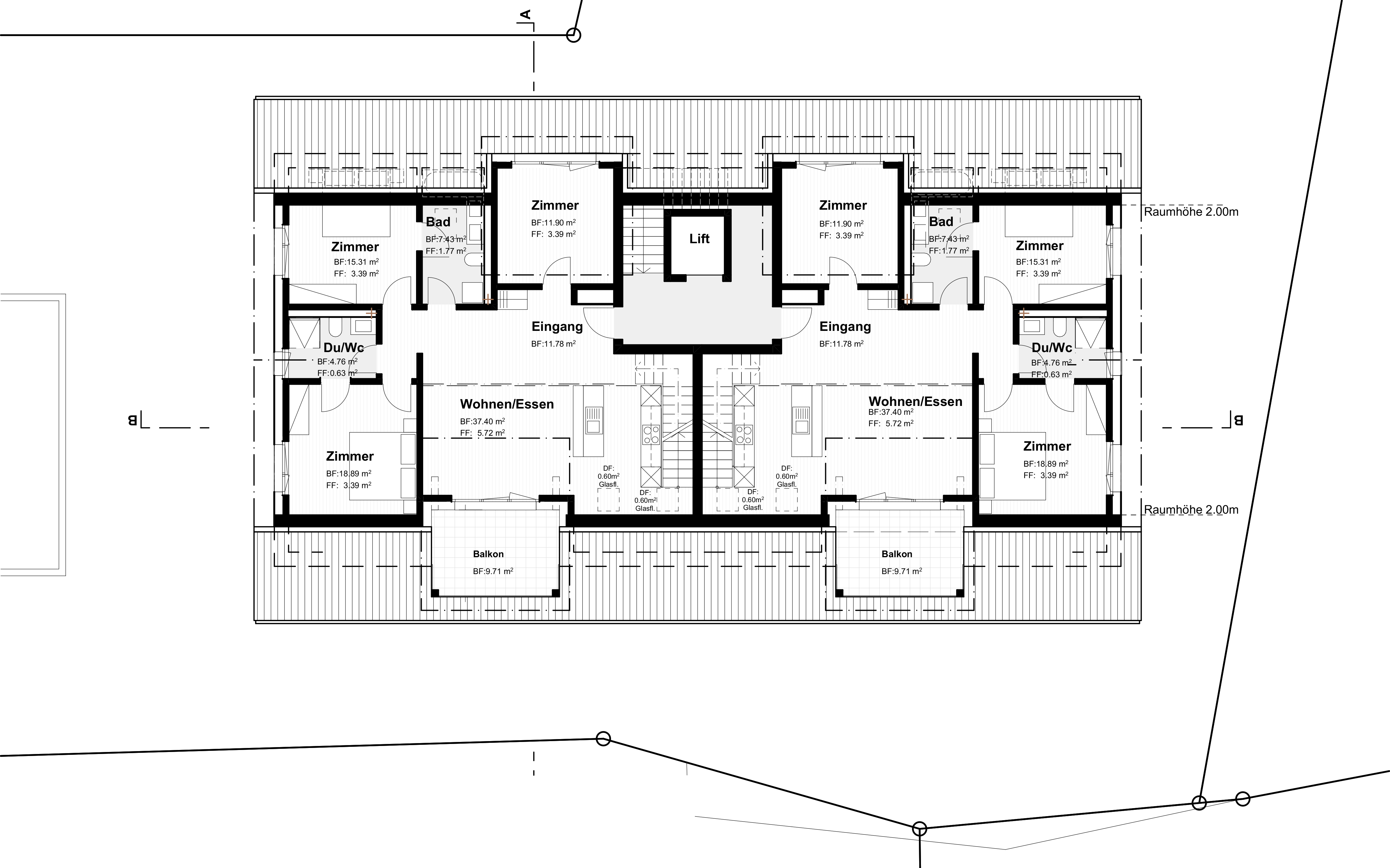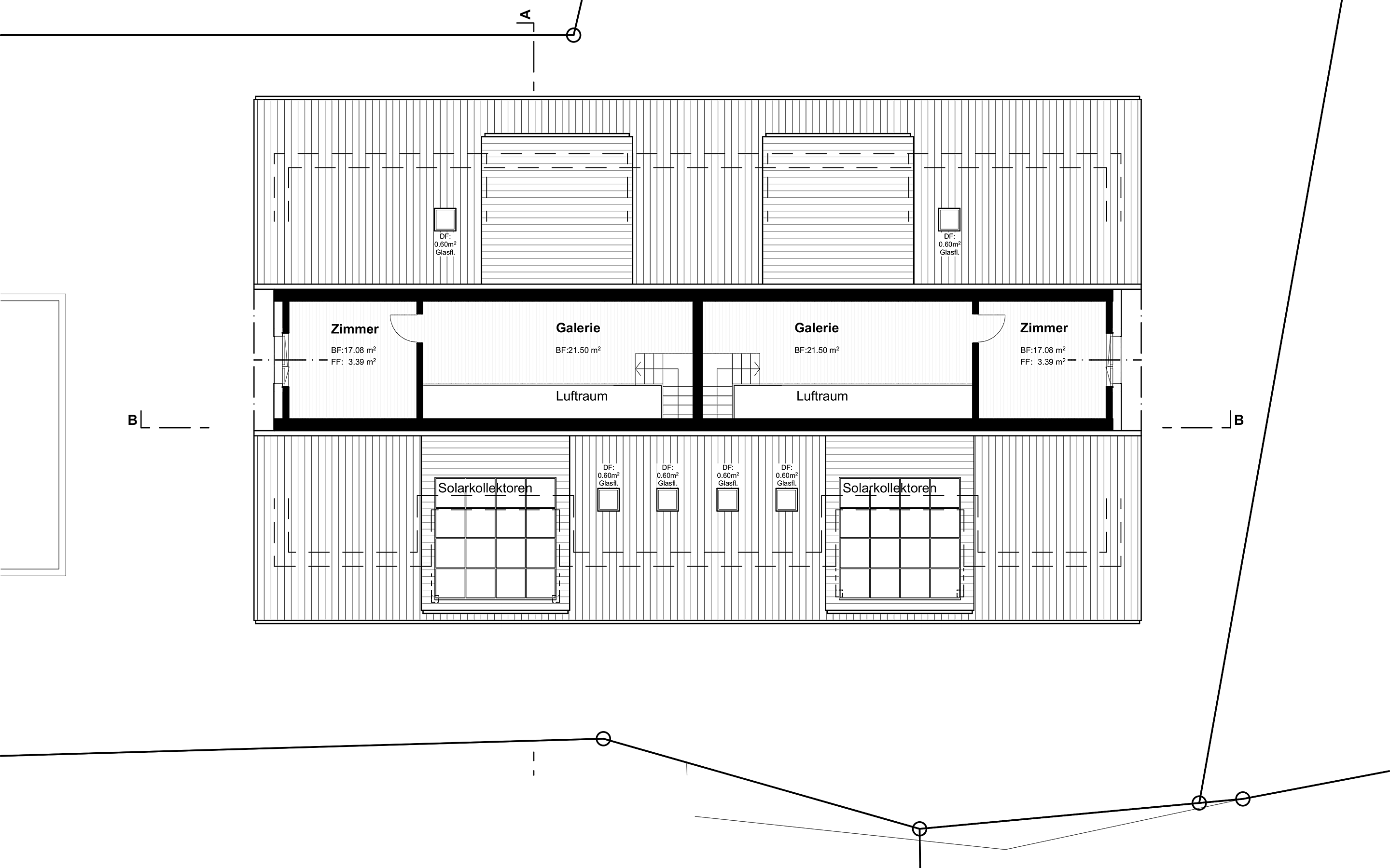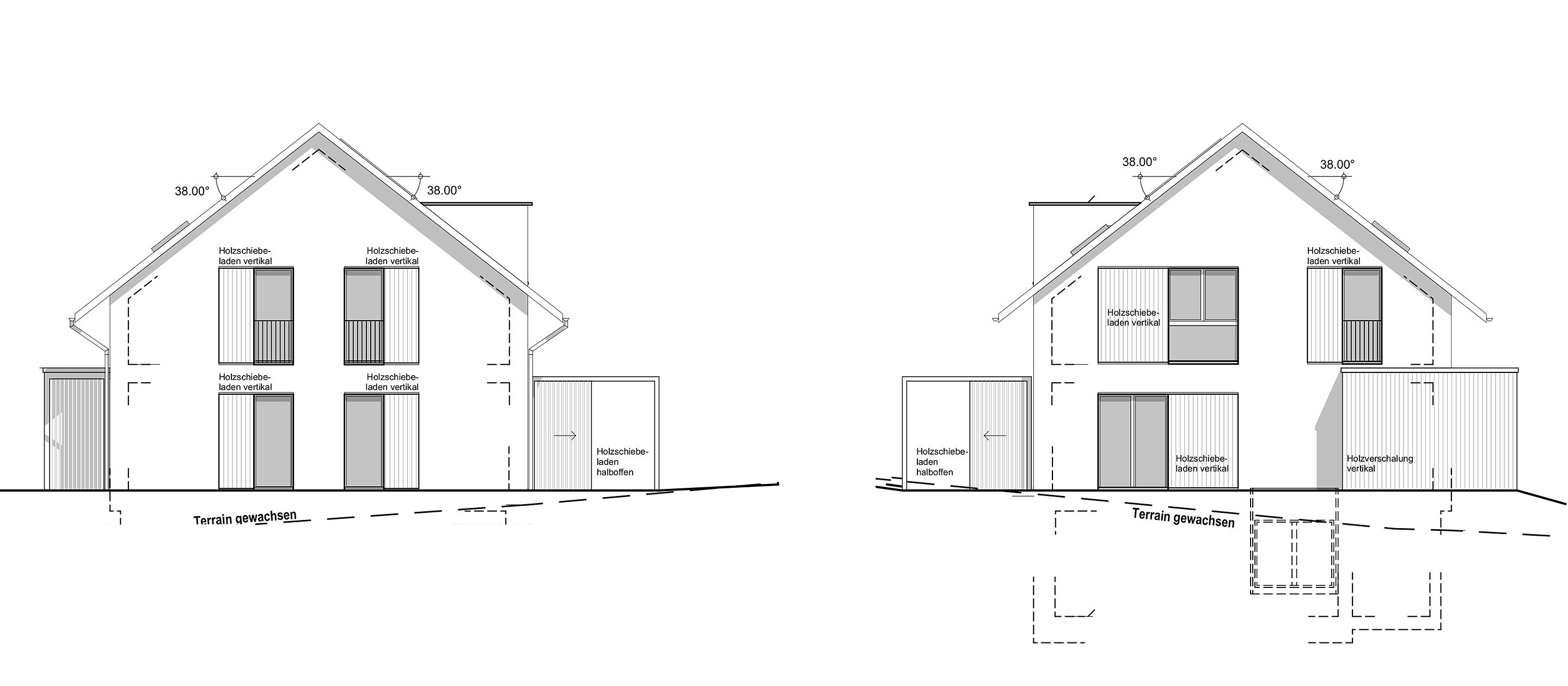 Die beiden Baukörper verfügen über ein gemeinsames Untergeschoss mit offener und gedeckter Einstellhalle und den Kellerräumen des Einfamilienhauses.