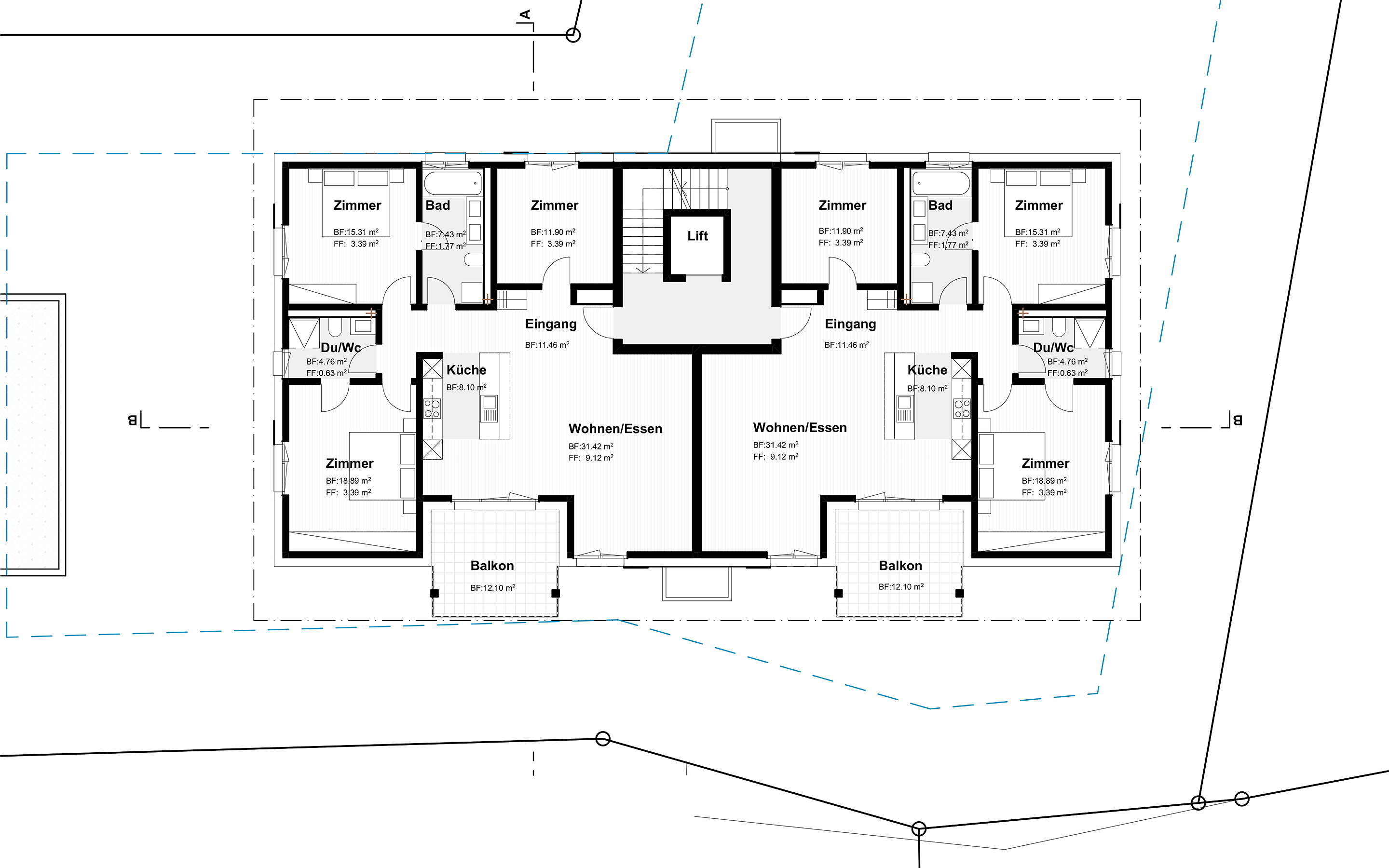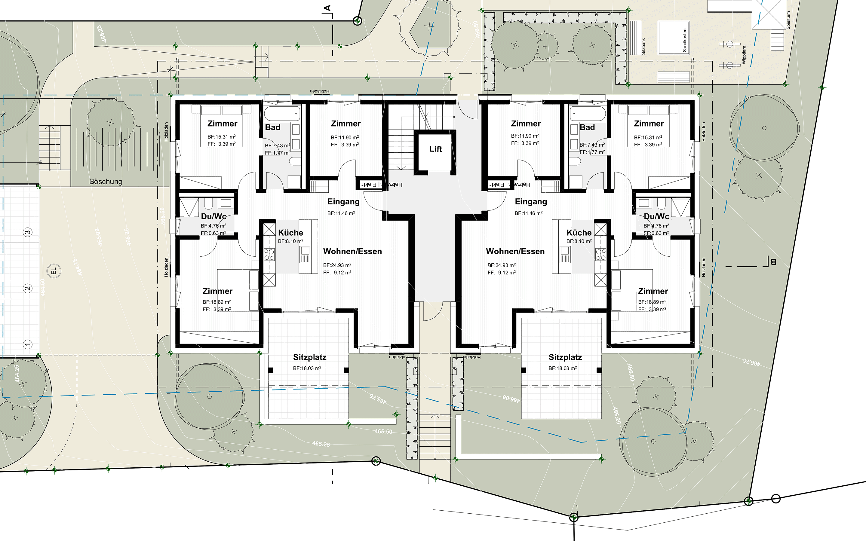 In dieser attraktiven Umgebung entstehen ein Einfamilien- und ein Mehrfamilienhaus. Vier 4½-Zimmer-Wohnungen im Erd- und Obergeschoss sowie zwei 5½-Zimmer-Wohnnungen auf zwei Ebenen im Dach- und Kehlgeschoss stehen zum Verkauf im Mehrfamilienhaus. Das Einfamilienhaus mit Keller-, Erd- und Dachgeschoss wird in einer neuen separaten Parzelle gebaut.