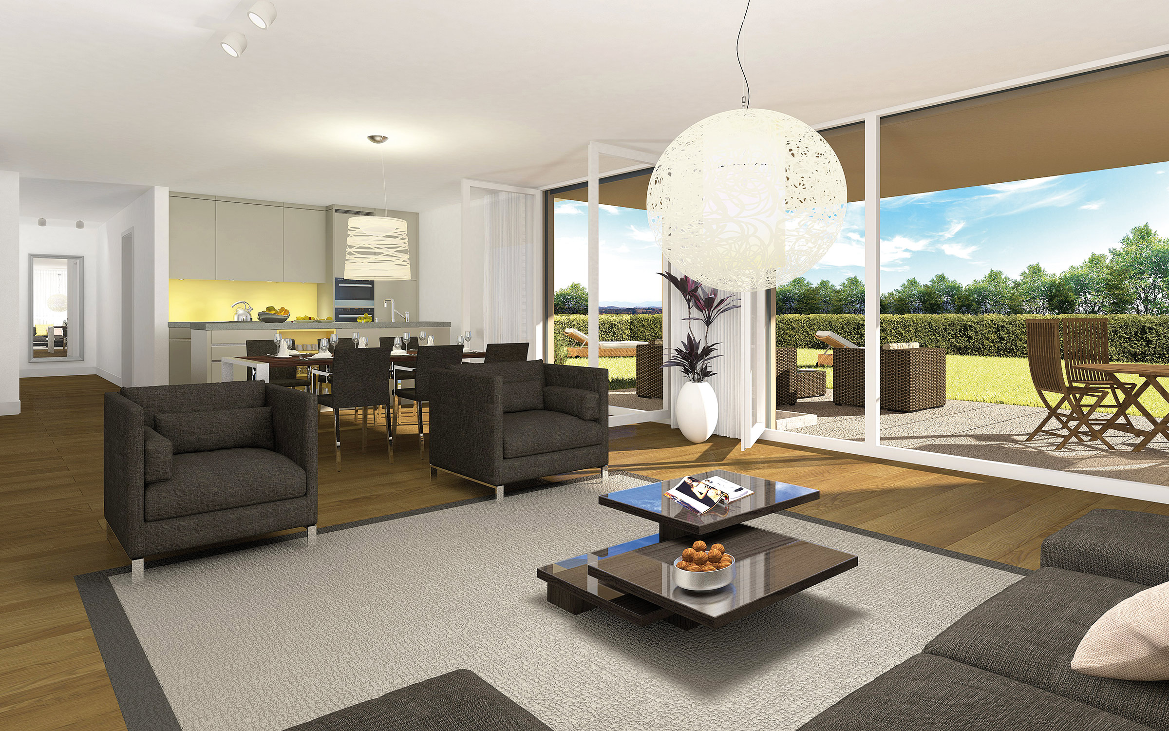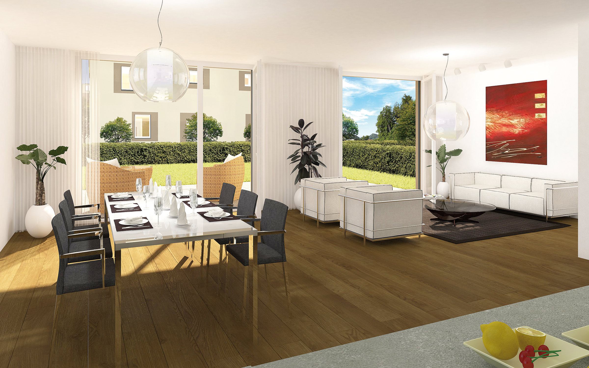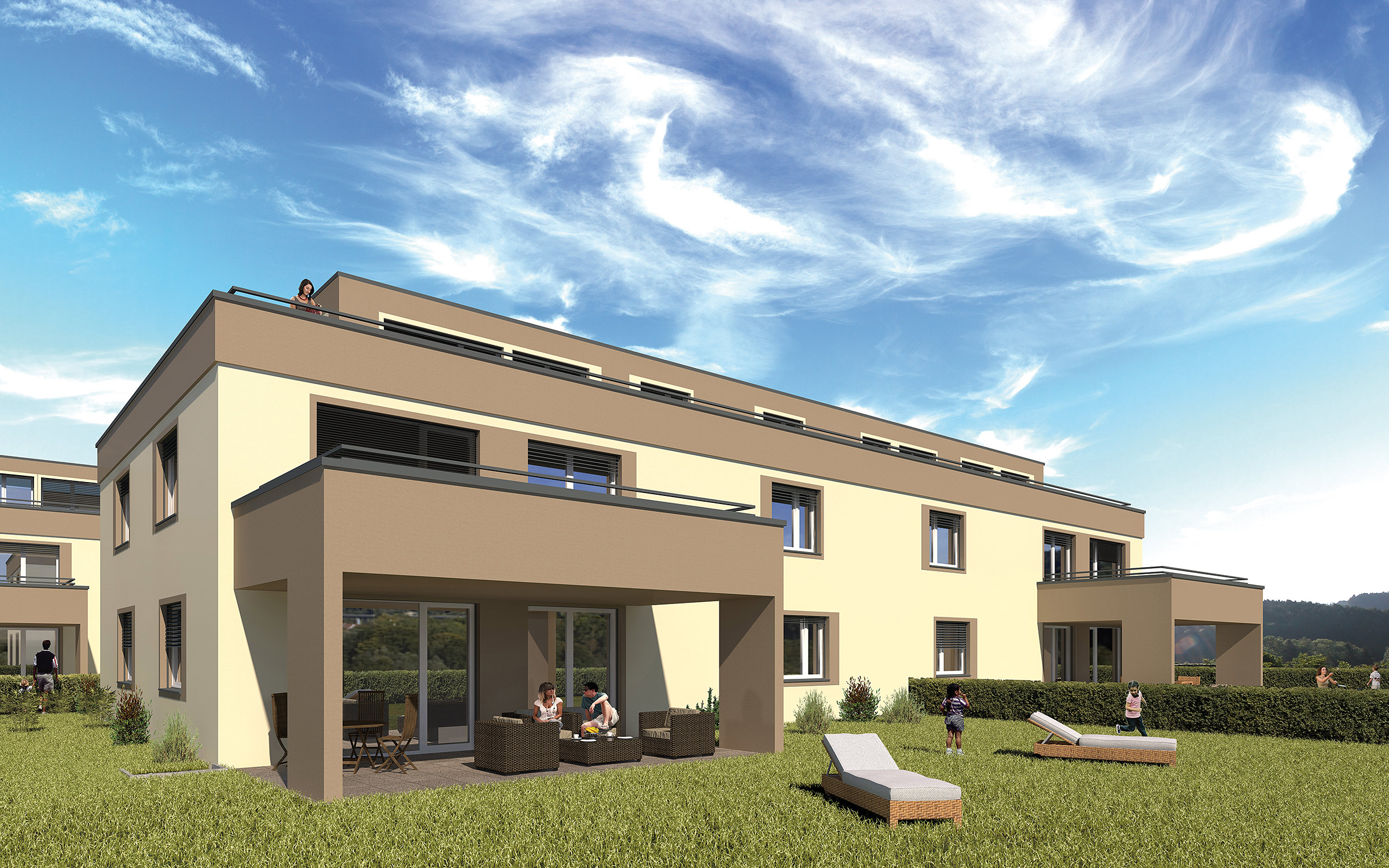 Je zwei Wohnungen im Erd- und Obergeschoss ermöglichen eine optimale Besonnung. Und die beiden Attikawohnungen mit 150 m² Wohnfläche und über 100 m² Terrasse haben traumhafte Dimensionen.