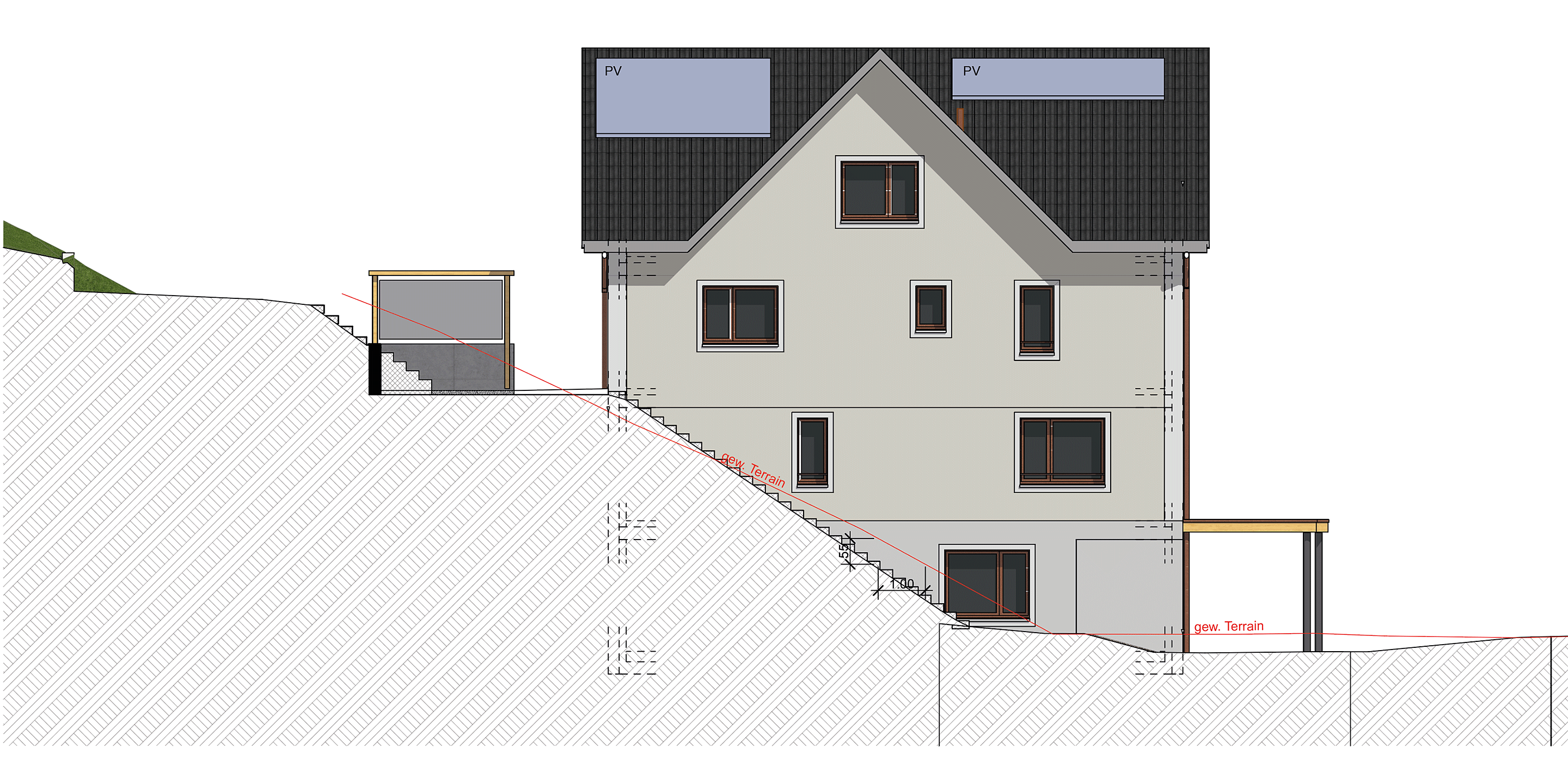 Für jedes Haus stehen zwei Aussenparkplätze zur Verfügung, die direkt von der Sägestrasse aus erreichbar sind. Im hinteren Teil der Parzellen, mit Gärten, Rasen und Wiesen – erhöht durch die Hanglage – entstehen zudem gedeckte Sitzplätze.