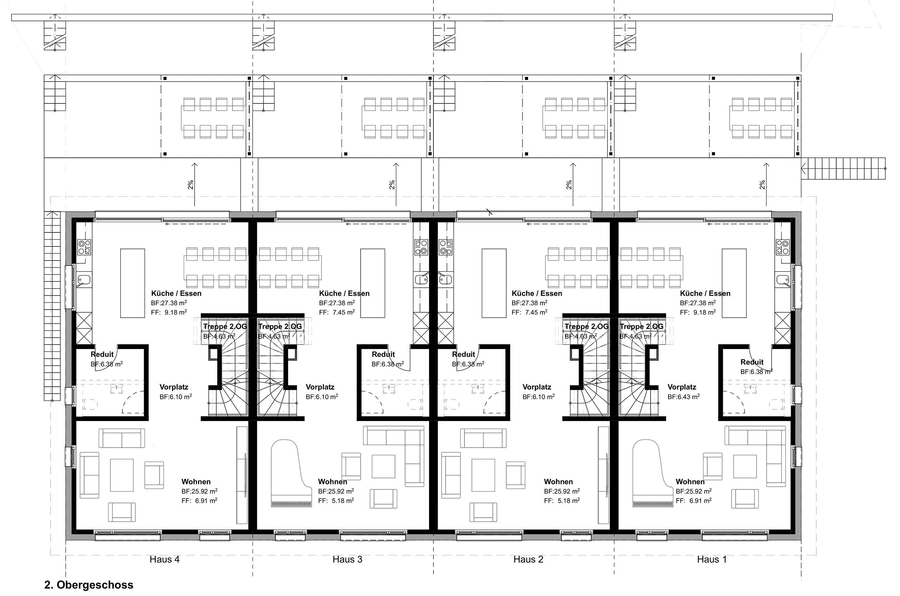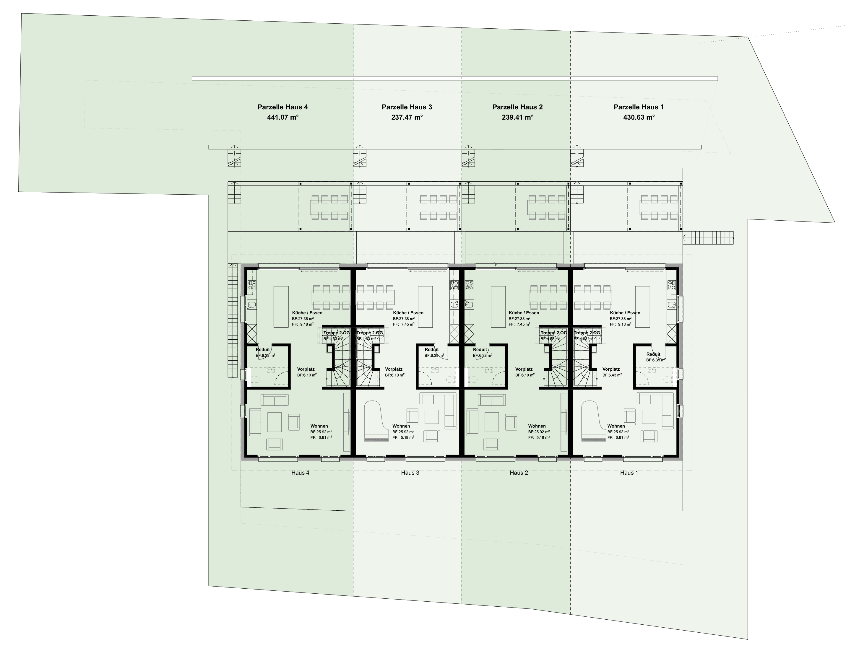 Alle vier Häuser verfügen über rund 267 m² Brutto-Wohnfläche. Diese verteilt sich auf vier Geschosse; vom Erdgeschoss bis zum Dachgeschoss. Die Räume sind so konzipiert, dass sie der Geländeform entsprechend perfekt angepasst sind.