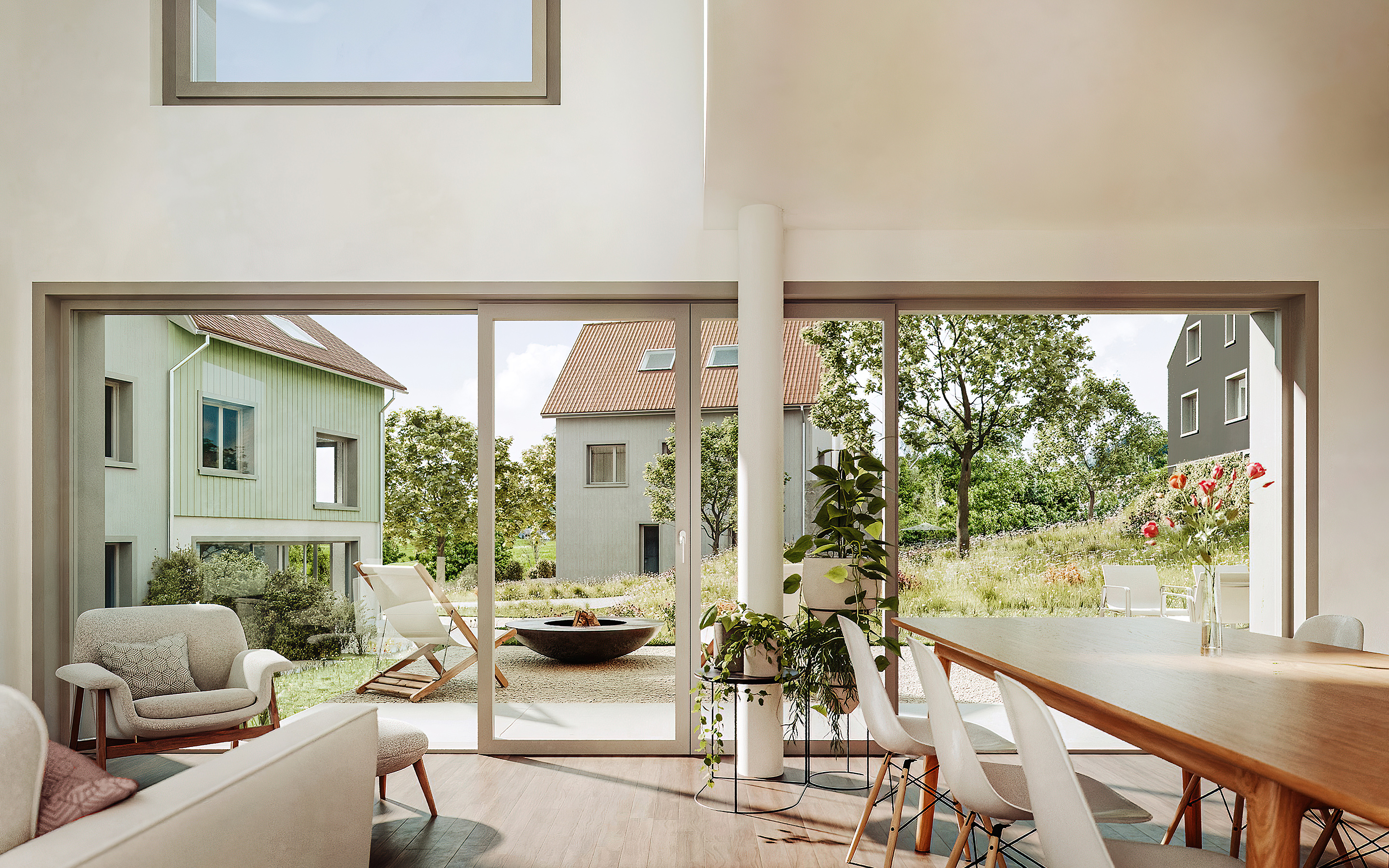 Ob Einfamilienhaus, Doppel-Einfamilienhaus oder Reihen-Einfamilienhaus: Die Platzverhältnisse in dieser Wohnüberbauung vermitteln bei allen Angeboten Grosszügigkeit und einen geschützten, verkehrsfreien Aussenbereich mit Gelegenheiten für alle möglichen Aktivitäten von und mit Kindern und Nachbarn.